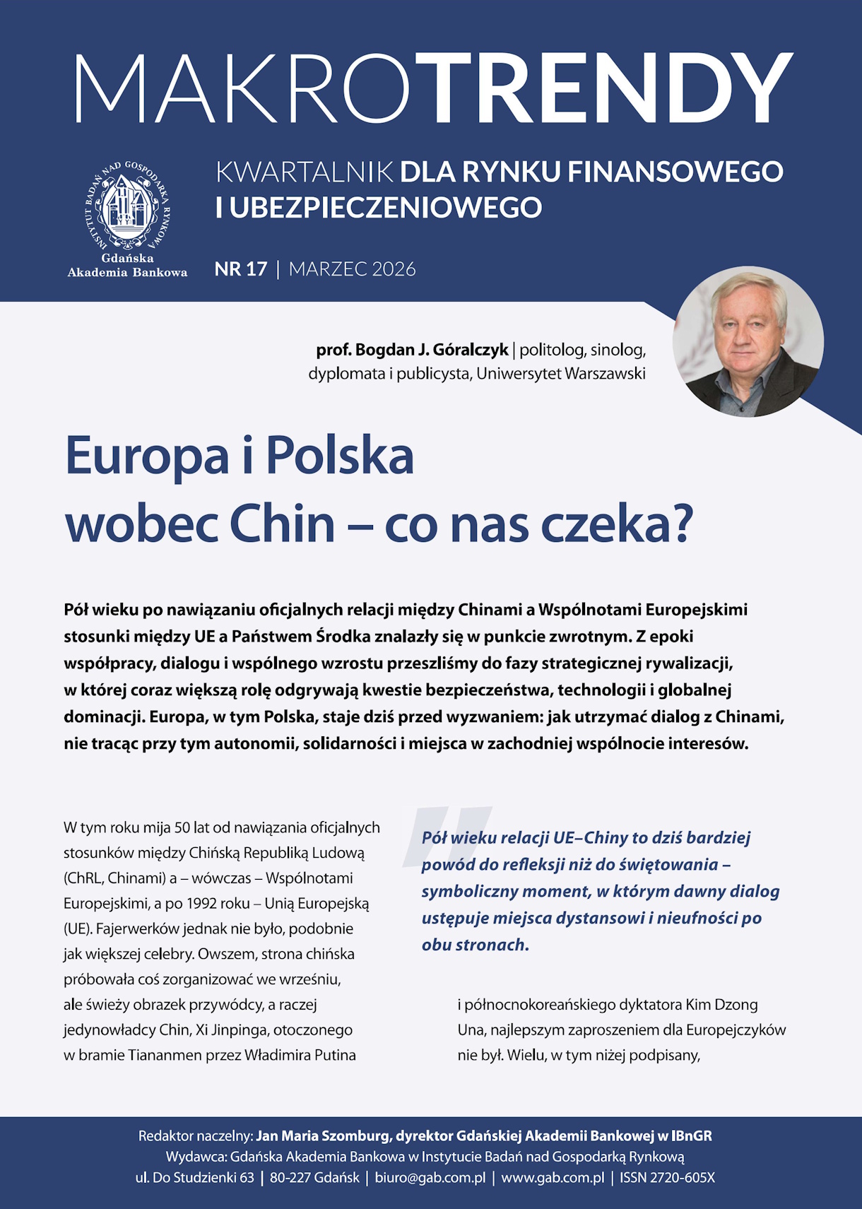 Pół wieku po nawiązaniu oficjalnych relacji między Chinami a Wspólnotami Europejskimi stosunki między UE a Państwem Środka znalazły się w punkcie zwrotnym. Z epoki współpracy, dialogu i wspólnego wzrostu przeszliśmy do fazy strategicznej rywalizacji, w której coraz większą rolę odgrywają kwestie bezpieczeństwa, technologii i globalnej dominacji. Europa, w tym Polska, staje dziś przed wyzwaniem: jak utrzymać dialog z Chinami, nie tracąc przy tym autonomii, solidarności i miejsca w zachodniej wspólnocie interesów.